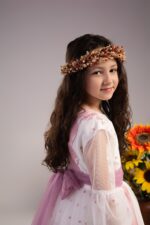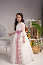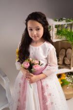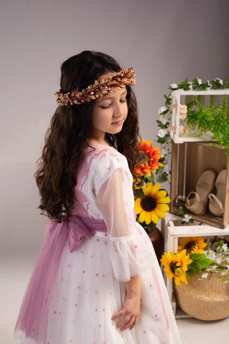 Este vestido es ideal para una comunion, combinando tradicional con detalles modernos y sofisticados., tul bordado