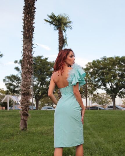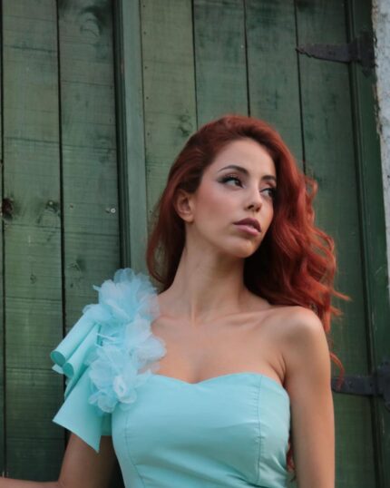 Corpiño de encaje con transparencia y escote pronunciado, corte de falda en V trasero y detalles plisados en la falda de raso para favorecer la figura.